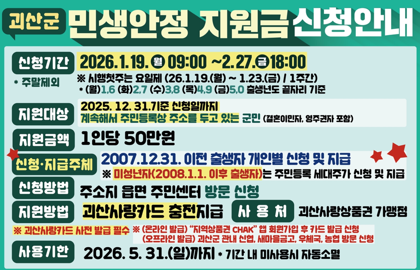 • 대상 기준일: 2025년 12월 31일 기준으로 주민등록이 괴산군에 있는 군민
