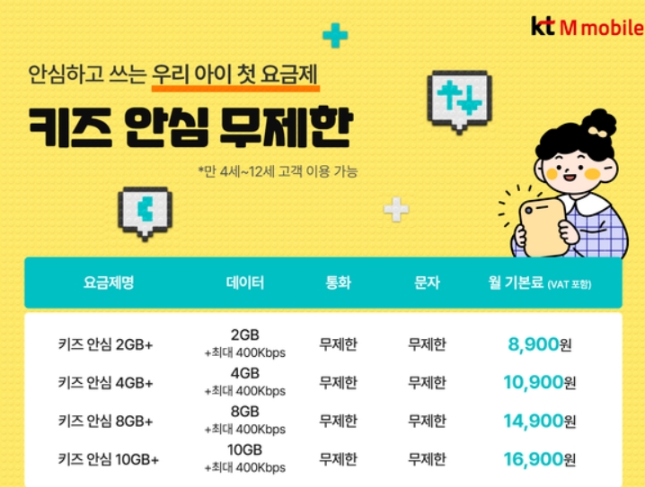 | KT | Y주니어 ON | 24,000원 | 1.5GB + 400Kbps 무제한 | 60분 | 부모 안심 서비스 |