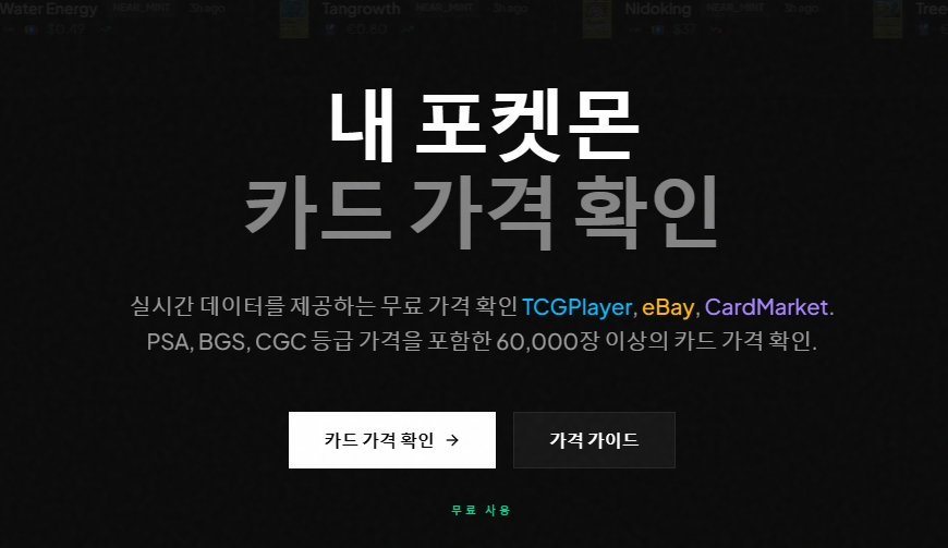 이 사이트는 TCGPlayer, eBay, CardMarket 같은 해외 거래 데이터를 기반으로 실시간 가격을 보여주는 플랫폼입니다. 또한 PSA, BGS, CGC 같은 카드 등급별 시세도 확인할 수 있습니다. 특히 장점은 카드 사진을 스캔하거나 이름을 검색하면 바로 가격 정보를 확인할 수 있다는 점입니다. 현재 6만 장 이상의 카드 데이터가 등록되어 있으며 24시간 시세 업데이트가 이루어집니다.