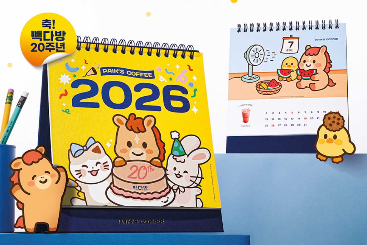 최근 눈에 띄는 이벤트 중 하나는 빽다방에서 진행하는 달력 증정입니다. 11월 24일부터 1만 원 이상 구매 시, 2026년 말띠 캐릭터가 들어간 20주년 한정 캘린더를 증정하고 있는데요.